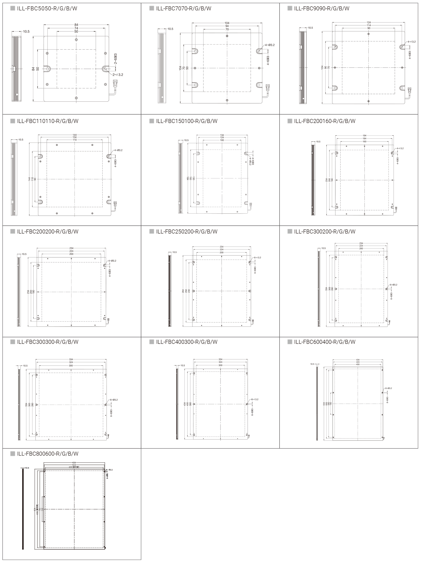 | ILL-FBC9090-R/G/B/W | 24V | 12W | 13.2W | 124 | 124 | 10.5 | |